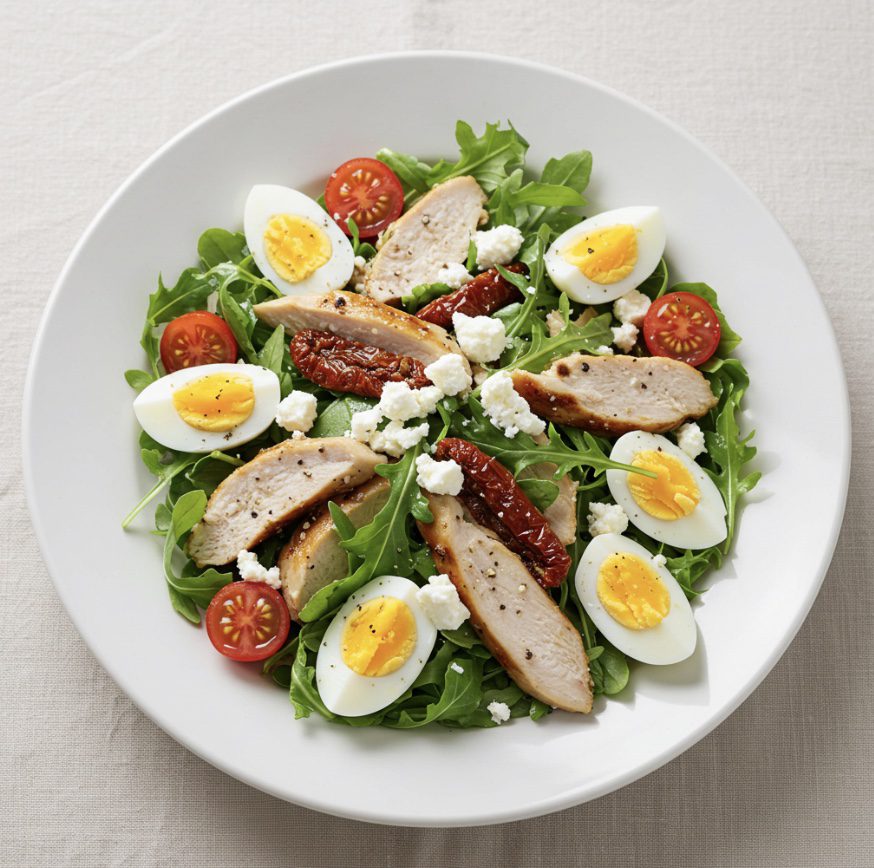 Place the arugula, tomatoes, and chicken in a bowl. Top with the egg and feta. When ready to eat, drizzle the dressing on top.