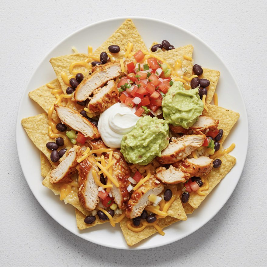 I like to add chips, beans, chicken, and cheese to a tray and broil (or stick in the toaster oven if it’s one serving), then top with cold ingredients.